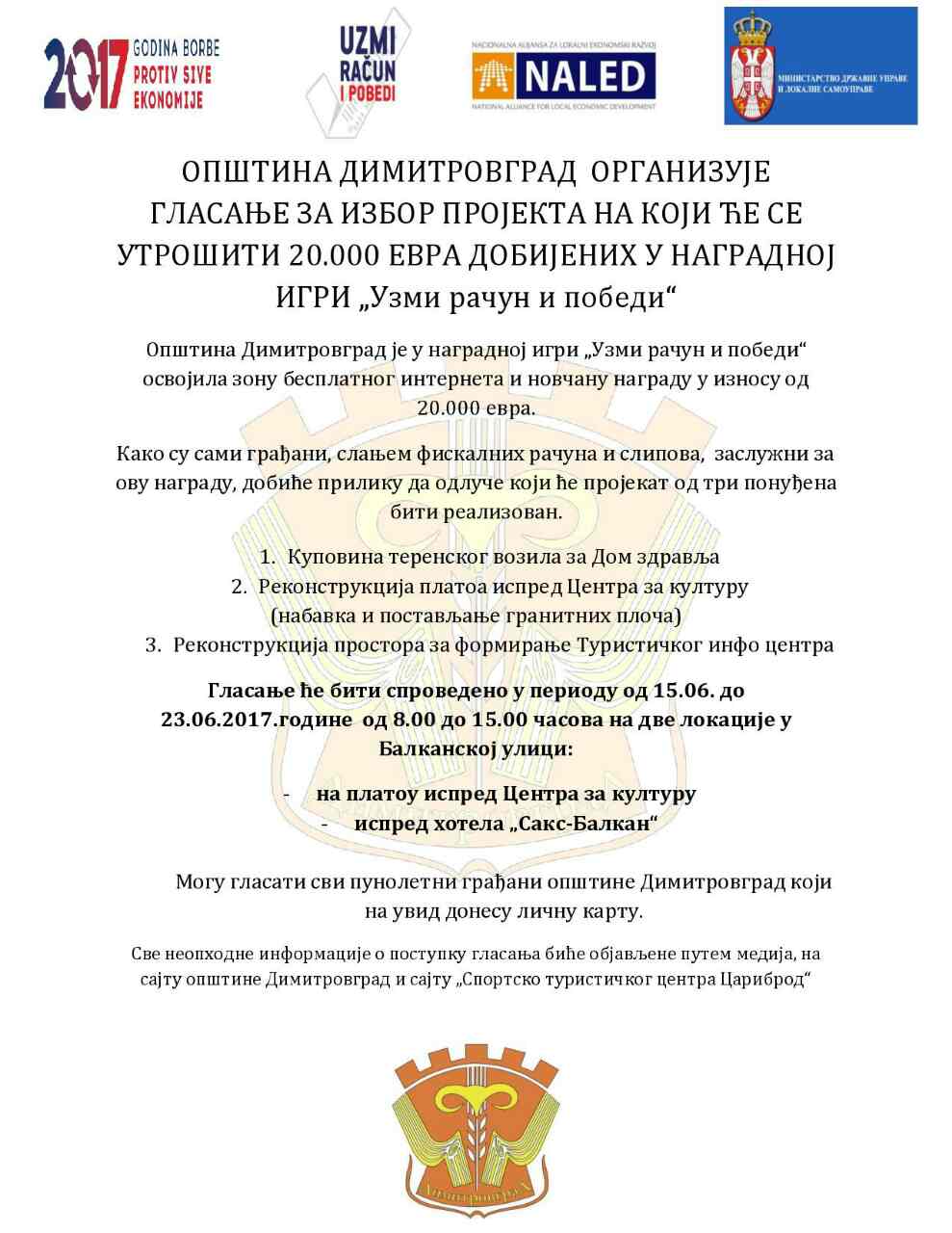 ОПШТИНА ДИМИТРОВГРАД ОРГАНИЗУЈЕ ГЛАСАЊЕ ЗА ИЗБОР ПРОЈЕКТА НА КОЈИ ЋЕ СЕ УТРОШИТИ 20.000 ЕВРА ДОБИЈЕНИХ У НАГРАДНОЈ ИГРИ ОБАВЕШТЕЊА 12.06.2017